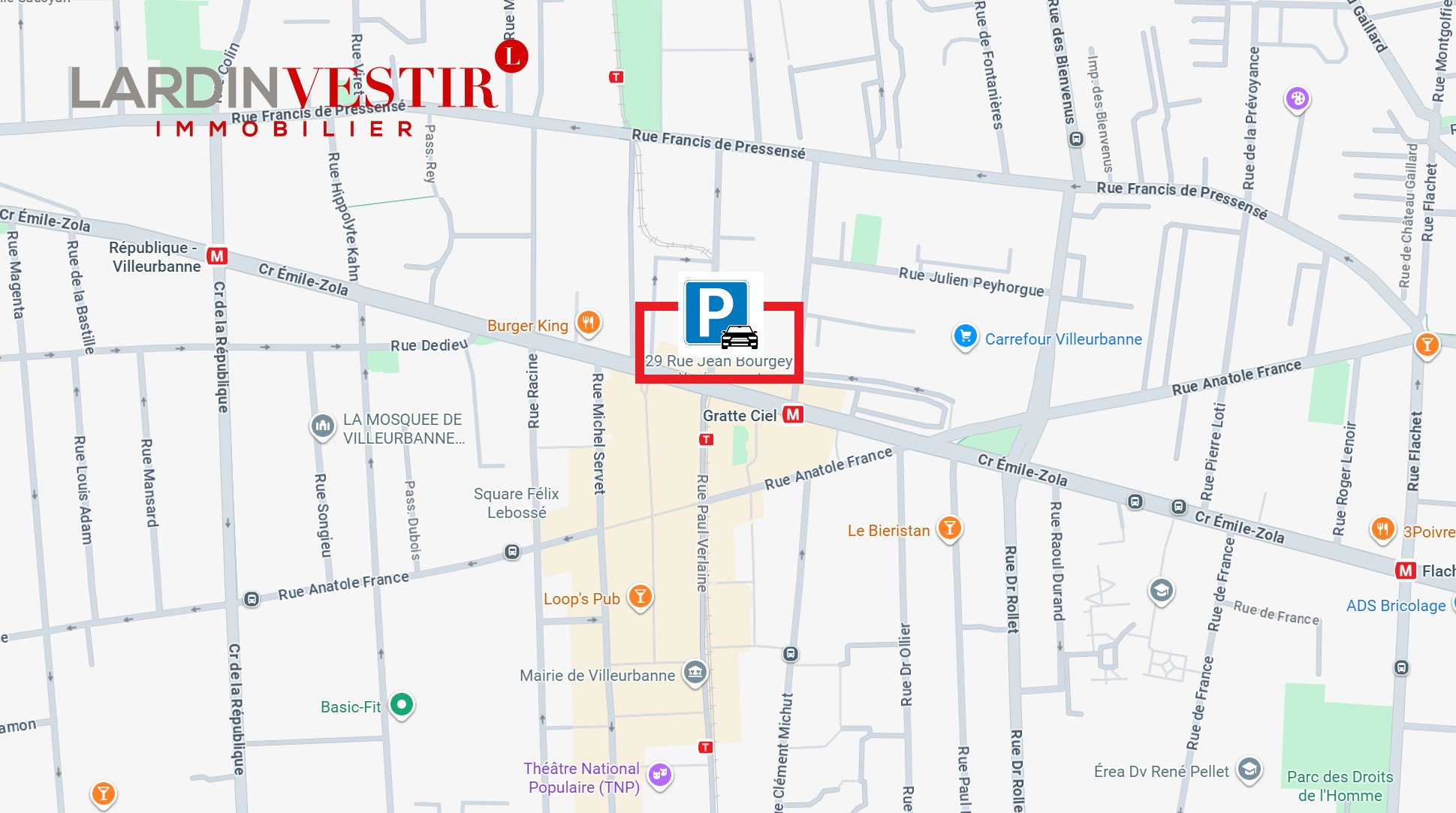 LARDINVESTR Immobilier vous propose en Exclusivité ce garage simple (box) au 2ème sous-sol d'une copropriété sécurisée « Résidence Plein Ciel », située au cœur du quartier des Gratte-Ciel à Villeurbanne, angle Crs Émile Zola / Rue Jean Bourgey, à proximité immédiate du métro ligne A et du tramway T6, idéal pour laisser votre véhicule et vous rendre rapidement dans le centre de Lyon.