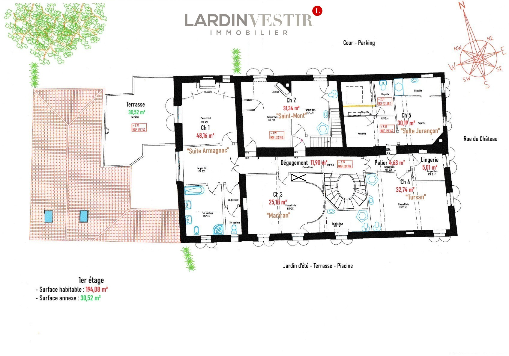 Caractéristiques complémentaires : Chauffage individuel gaz chaudière à condensation « Viessmann » de 2020 - Production d’eau chaude par 3 cumulus de 300 l. - Climatisation 2ème étage - Volets, huisserie et fenêtres changés en 2020 - Portail sur rue changé en 2020 (pré-équipé pour motorisation) - Toiture en TBE (rénovée en 2012) - Piscine 5x10 m (sécurisée par alarme, traitement au sel, liner PVC armé) - Equipé fibre -Diagnostic de performance énergétique (DPE) : Consommation conventionnelle 167 kWh/m²/an (Classe C), Estimation des émissions : 23 kg CO2/m²/an (Classe C). Estimation des coûts énergétiques annuels : entre 5 170 et 7 100 €/an (actualisé le 27/04/2026)