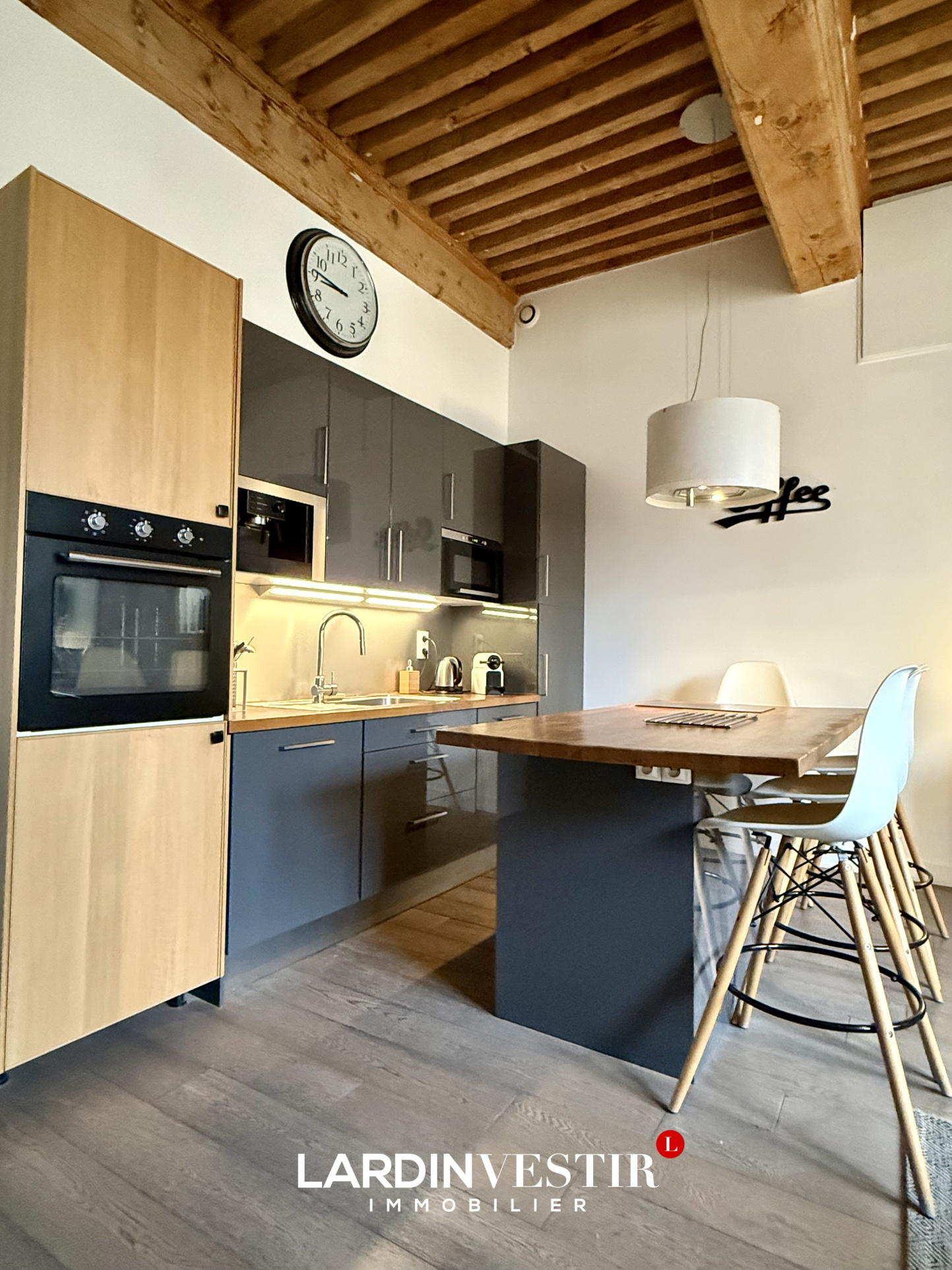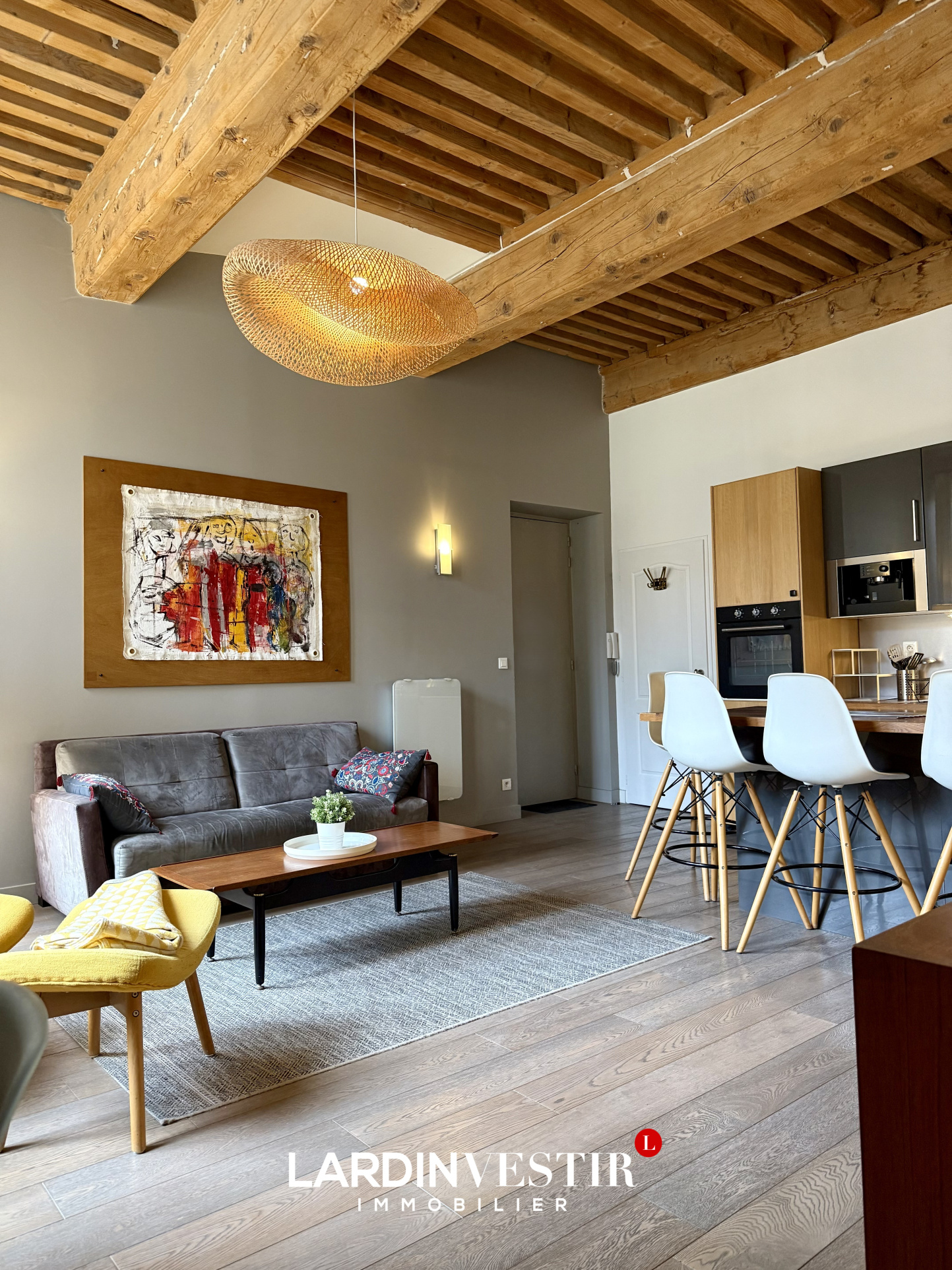 Dès l’entrée, l’atmosphère chaleureuse et le caractère unique de l’appartement se révèlent, grâce aux poutres et pierres apparentes et à une hauteur sous plafond exceptionnelle de 3,58 m. La pièce de vie de 31 m² accueille un séjour convivial avec cuisine américaine équipée et îlot central, créant un espace fonctionnel, exposé plein sud et offrant une vue imprenable sur le dôme de l’Hôtel de Ville.